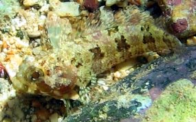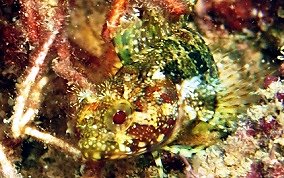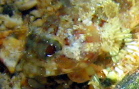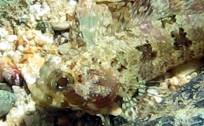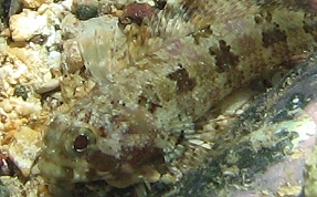 Gobioclinus bucciferusSeldom seen because they hide under rock/coral rubble in shallow areas and small patch reef and rely on their perfect camouflage to avoid being seen. This specimen was found in 2 feet of water. A medium sized blenny growing up to about 3 inches. The wide dark band below their eye helps distinguish them from other similarly marked blennies and the Mimic Blenny. Note the large "sail" fin at the fore dorsal area. No distinct markings in the iris of the eye.