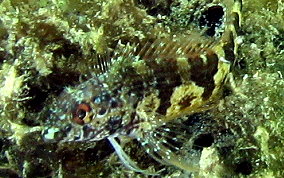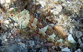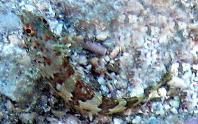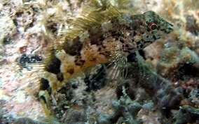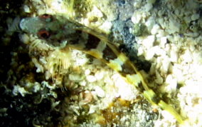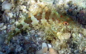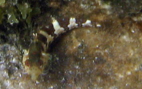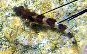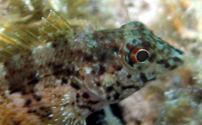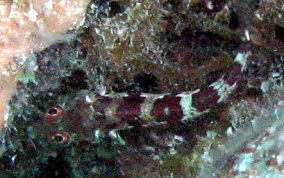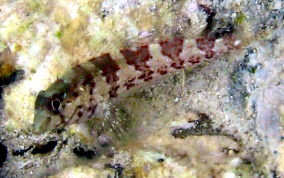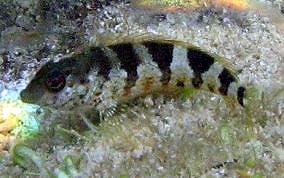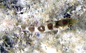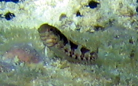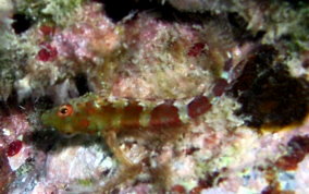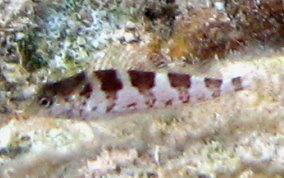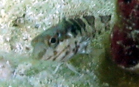 Malacoctenus triangulatusThe Saddled Blenny has four "saddles" (with stirrups that cross below the mid-line on their sides). Also look for a red spot on the top of their heads, which could be a designation of male or female because they don't all display it. The saddles often have white spots in the middle of the saddles and their colors vary from black on white to copper on white with some yellows and greens thrown in. they tend to be a bit larger than the Rosy Blenny. They seem to want to always be directly below you, looking up with those reddish/golden eyes. They sometimes show reddish areas between the stirrups, as in picture 5. They skip around the bottom or along a wall area, to here, there, and then over there and back again. They are omnivorous, eating a variety of foods including tiny crustaceans, and other food particles that float past in the water stream.