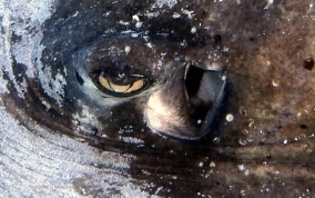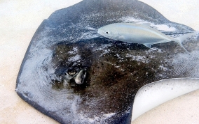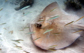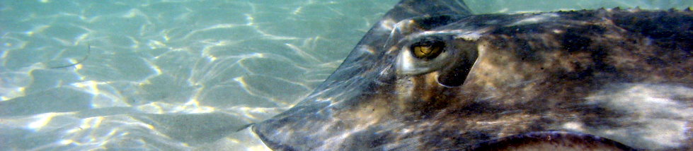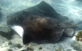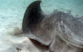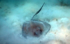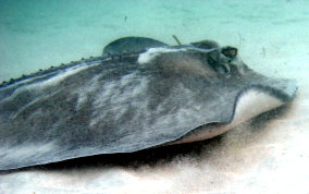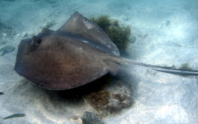 Dasyatis americanaThe Southern Stingray is the only commonly seen member of the stingray family that inhabits our waters. They are seen cruising sandy bottoms and sea grass beds for their food, a diet of mollusks, small crustaceans and fish. They are quite docile in nature, and pretty much ignore you, but they do have a venomous, serrated spine on their tail that they they use for defense. If you were to be stung, the wound can be quite painful. Full grown males reach a diameter of about 2 feet whereas the females have been recorded at almost 5 feet in diameter. Like sharks and skates, rays are cartilaginous, meaning they have skeletons made of cartilage rather than bones. Their gills are located on the bottom (ventral) side of their bodies. The openings behind their eyes are called spiracles. They use these almost like a mouth, taking in water that passes to their gill chambers. They are also used to expel the unpalatable parts of their prey. As you can see in the photos, (see row #2) the spiracle is first closed, then open to inhale then exhaling with shell debris. Watch my video here https://www.youtube.com/watch?v=GqOq9lowybQ