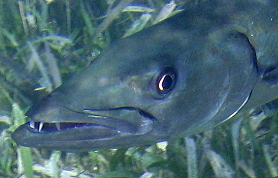 The barracuda is a long, thin fish with a long V-shaped jaw and large teeth. They have a forked tail and are generally green to bluish gray. Their back scales often glisten in a random sparkle and they usually have random, dark blotches on their sides.. The Great Barracuda of the Caribbean can grow up to six feet in length and is capable of striking with amazing speed and veracity. It is known to follow a swimmer or snorkeler out of curiosity, but seldom attacks. It is known to attack limbs dangling in the water on rare occasions. Barracuda bites are distinguishable from shark by the pattern. A barracuda leaves a V-shaped or straight wound, shark wounds have a curved outline. Attacks by barracuda are rarely life threatening.